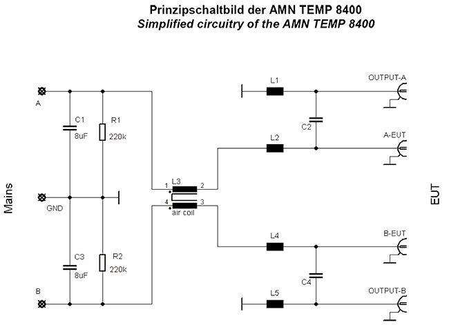 TEMP 8400为对称的交流网络,由两个相同的通道组成,用于线路“A”和“B”。它由空心电感构成,以避免互调干扰。为了评估干扰现象,可以测量 9 kHz 至 1 GHz 频率范围内导体对地参考的不对称干扰电压。 可通过附加的高通滤波器来减轻有可能会损坏测量接收器输入的低频干扰。