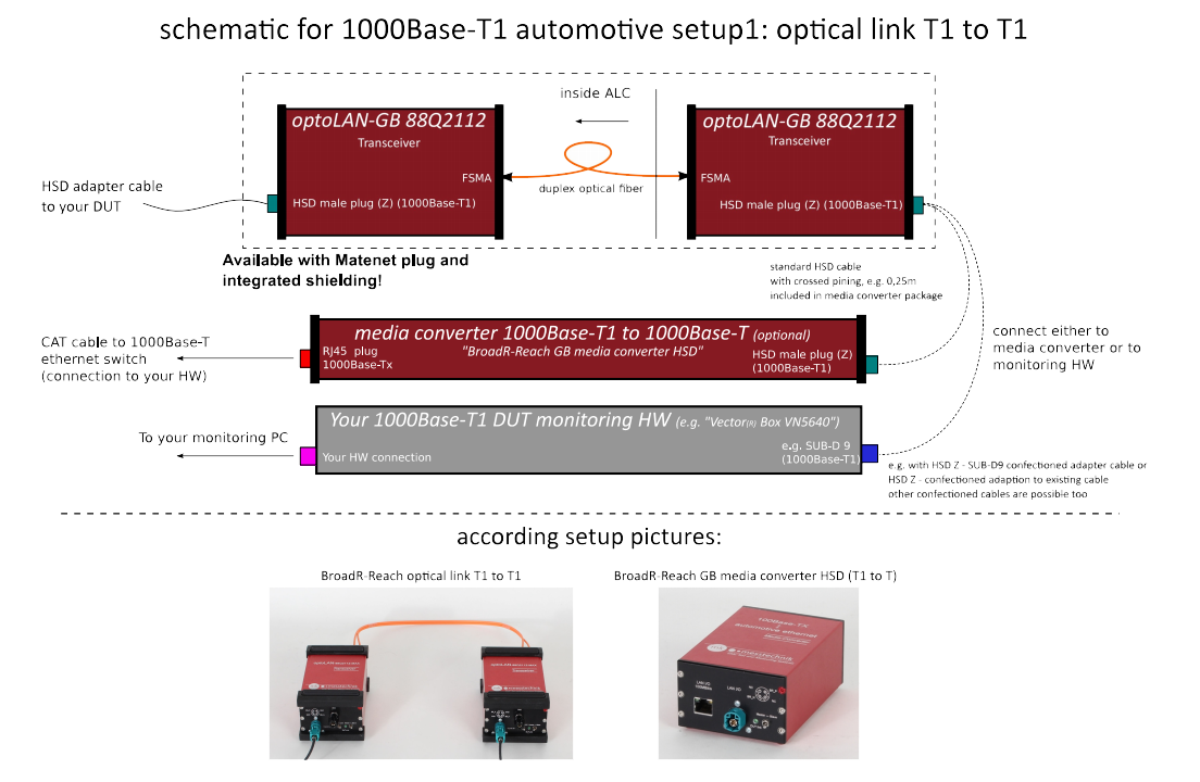 optoLAN-Gb 88Q2112光电隔离转换器用于汽车以太网1000 BASE-T1/100BASE-T1信号的数字双向光传输装置。可实现两种设置,T1-T1(标准)或T1-T(需转换器)。Rosenberger HSD(Z-coded)标准连接器,通过光纤相互连接,镍氢电池供电,金属屏蔽外壳。系统具备良好的EMI和EMS测试要求,并已在诸多汽车EMC实验室中得到验证。